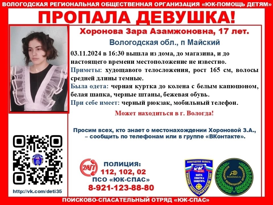 Жительница посёлка Майский Зара Хоронова ушла в магазин 3 ноября. Домой 17-летняя девушка не вернулась. В настоящее время её местонахождение неизвестно.