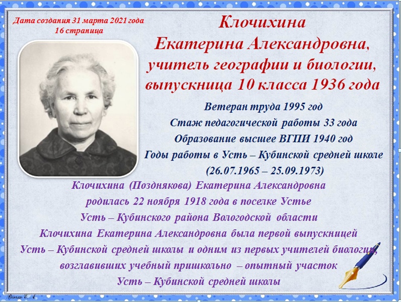 В июле 1943 года Клочихины приехали в Устье. Построили дом, воспитали троих детей. Всю жизнь устьянка трудилась, занималась физкультурой, много времени проводила на свежем воздухе. Увлекалась рыбалкой, ловила на самодельные снасти окуней щук; любила ходить в лес за грибами и ягодами, заниматься огородом, – сообщает ГТРК «Вологда» со ссылкой на страницу главы Усть-Кубинского округа Ивана Быкова.