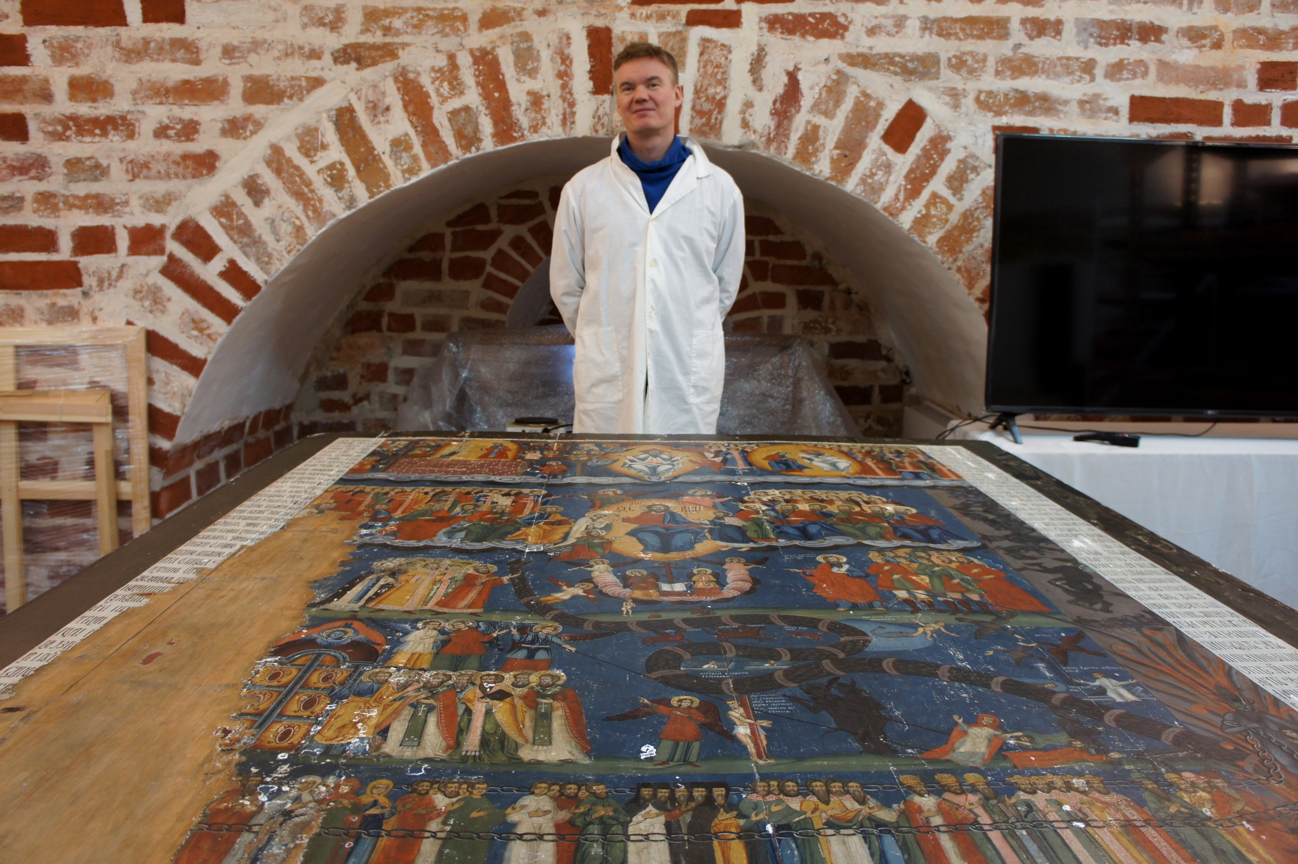 Над ним в одиночку работал заведующий отделом реставрации темперной живописи, художник-реставратор Николай Петухов. Размер иконы – 210 на 170 см. Её привезли в музей из церкви Преображения города Белозерска ещё в 40-е годы прошлого века. Образ находился в остро аварийном состоянии.