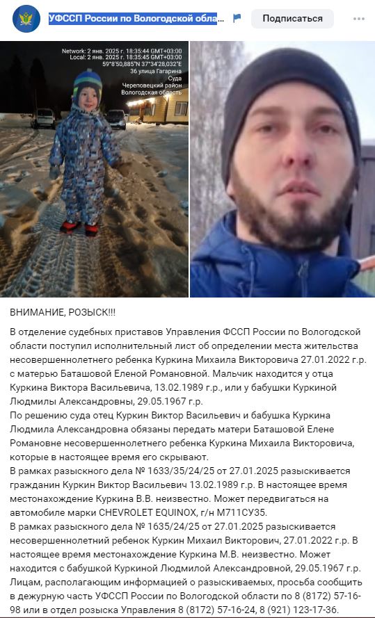 Всех, кто располагает, какой-либо информацией о местонахождении Миши Куркина просят срочно позвонить в Дежурную часть УФССП по Вологодской области: 8 (8172) 57-16-98 или в отдел розыска Управления 8 (8172) 57-16-24, 8 (921) 123-17-36, - сообщает ГТРК «Вологда» со ссылкой на официальное сообщество Службы судебных приставов.
