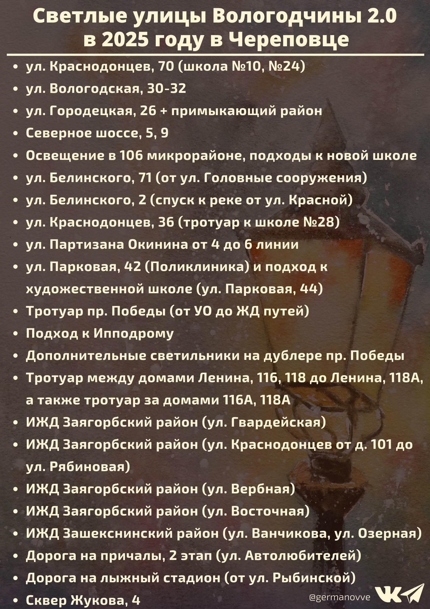 Работы по улучшению освещения городских улиц планируется закончить следующей осенью, – сообщает ГТРК «Вологда» со ссылкой на мэра Череповца Вадима Германова.