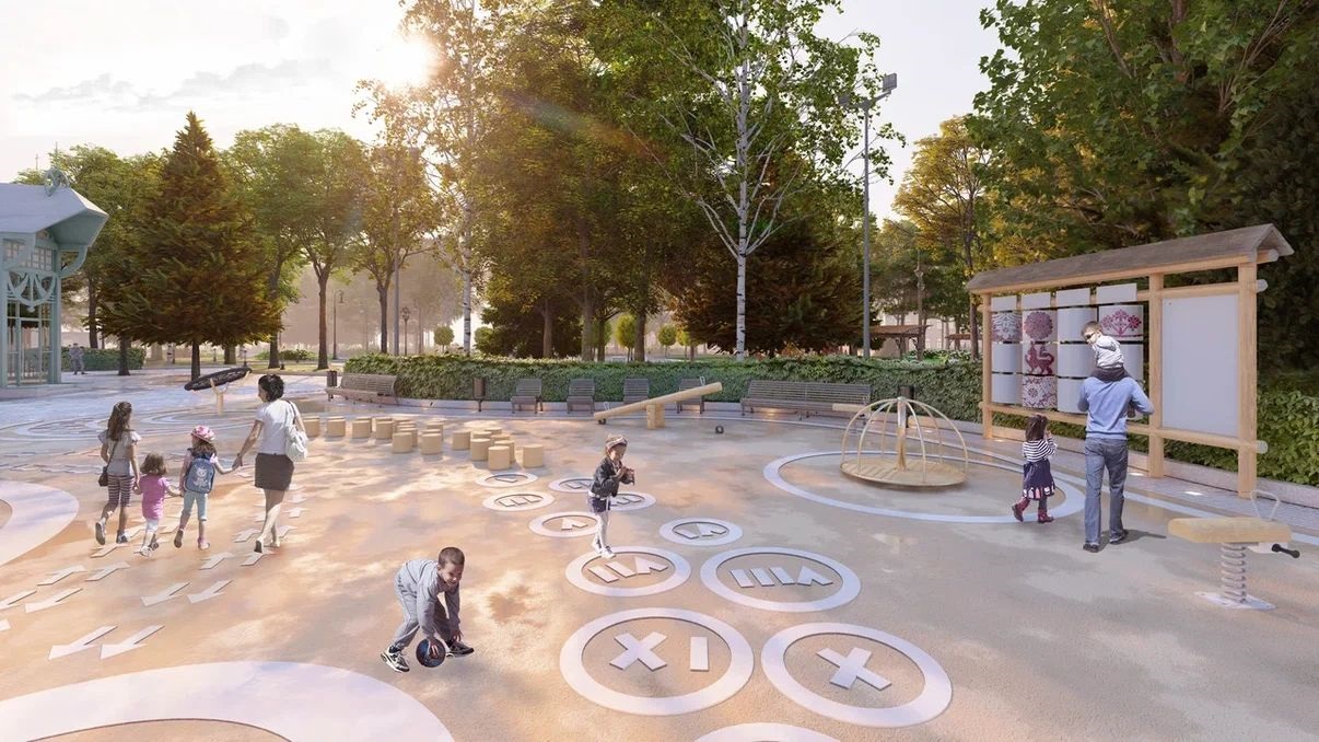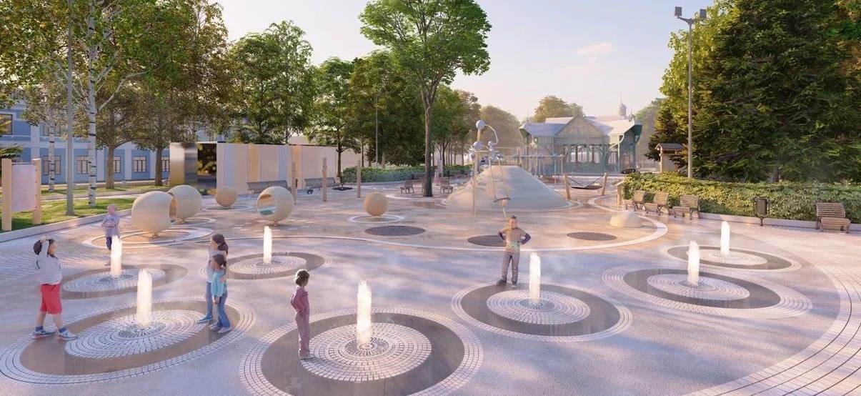 Рядом будет большая детская площадка с безопасным резиновым покрытием, рассчитанная на детей разных возрастов. На ней смонтируют карусели, качели, батуты, гамаки, шары с небольшими туннелями, балансиры, большой игровой комплекс и музыкальные инструменты, такие как уличный ксилофон и трубчатые колокола. Предусмотрен игровой пешеходный фонтан. Это создаст благоприятный микроклимат и даст дополнительные варианты использования пространства.