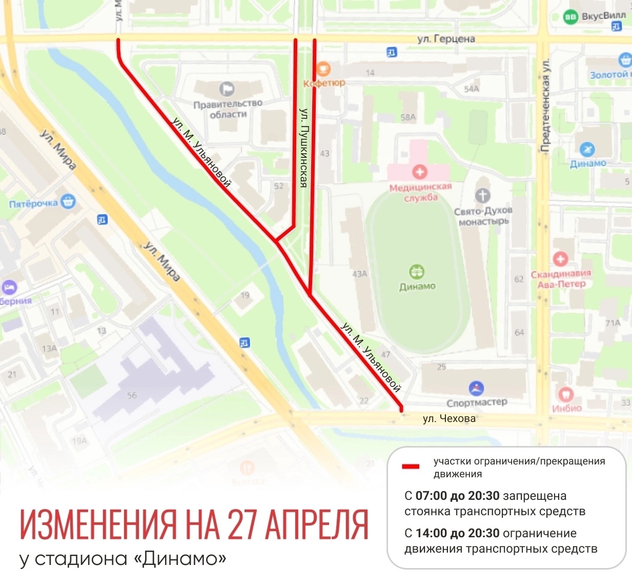 В этот день движение и стоянка автомобилей в центре города будут ограничены. Об этом предупредили в администрации областного центра. В частности, с 07:00 до 20:30 будет запрещена парковка на улицах Марии Ульяновой и Пушкинской. Там же с 14:00 до 20:30 ограничат движение автотранспорта.
