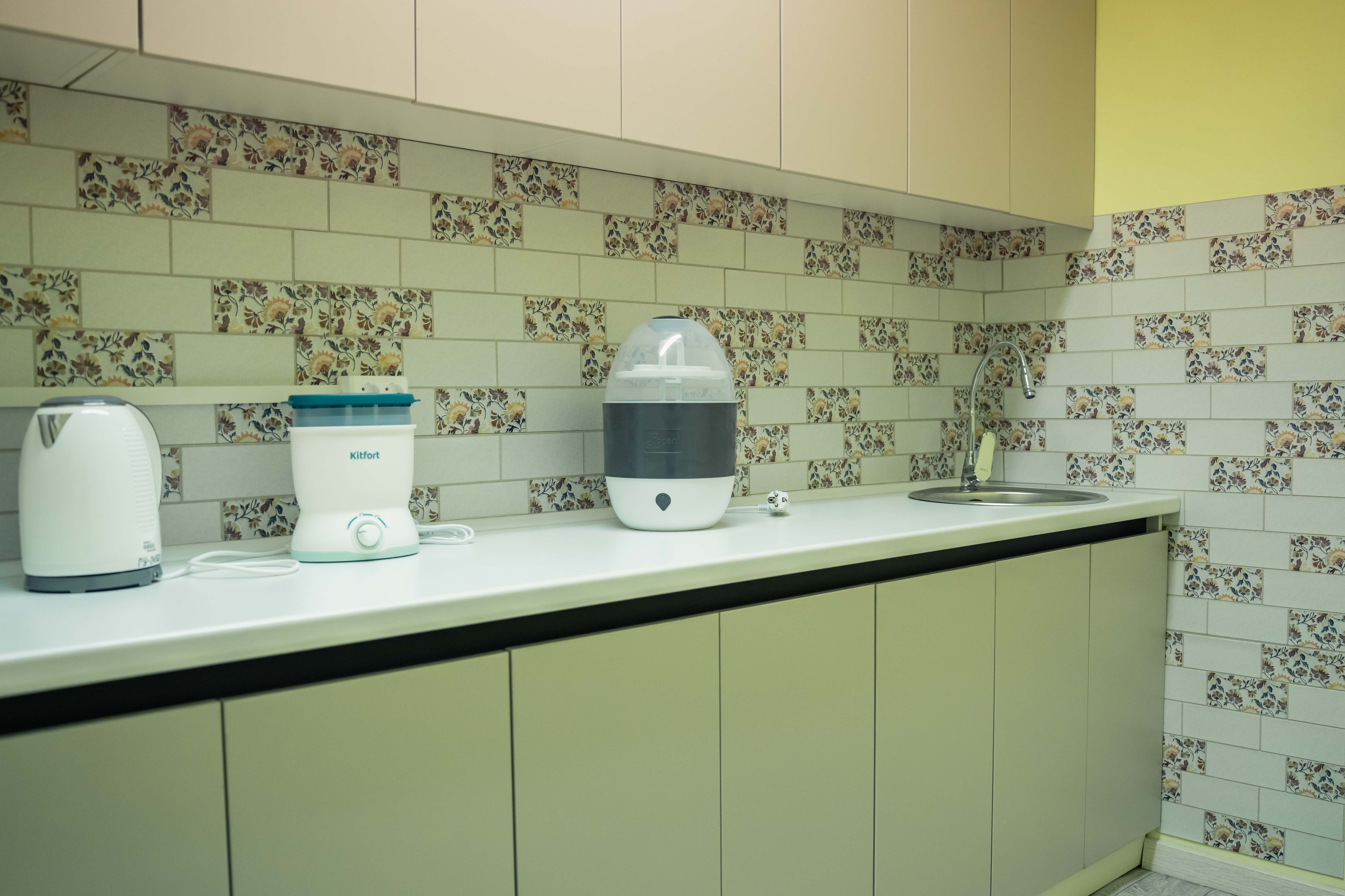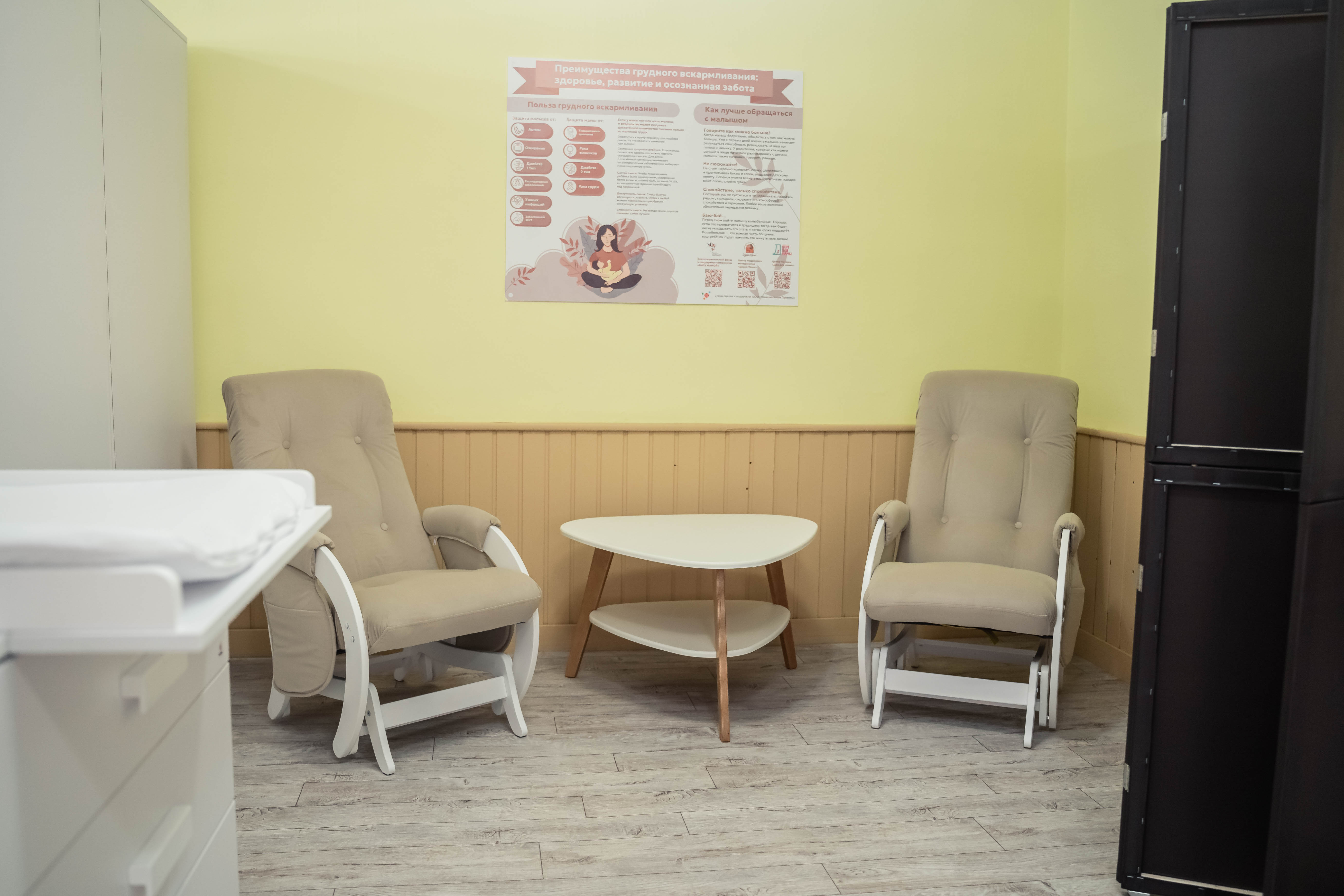 Общая площадь комнаты – 113,17 квадратных метров. Комплекс оснащен всем необходимым для комфортного пребывания мам и их детей. На сегодняшний день оборудованы зона кормления, игровая зона с детскими столами, стульями и игрушками, кухонная зона со всем необходимым.