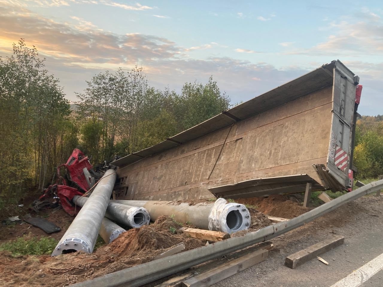 По предварительным данным, грузовой автомобиль MAN, перевозивший бетонные опоры, съехал в кювет и опрокинулся. В результате аварии кабина превратилась в груду искорёженного металла. За рулём фуры находился мужчина 1970 г. р. От полученных травм он скончался на месте.