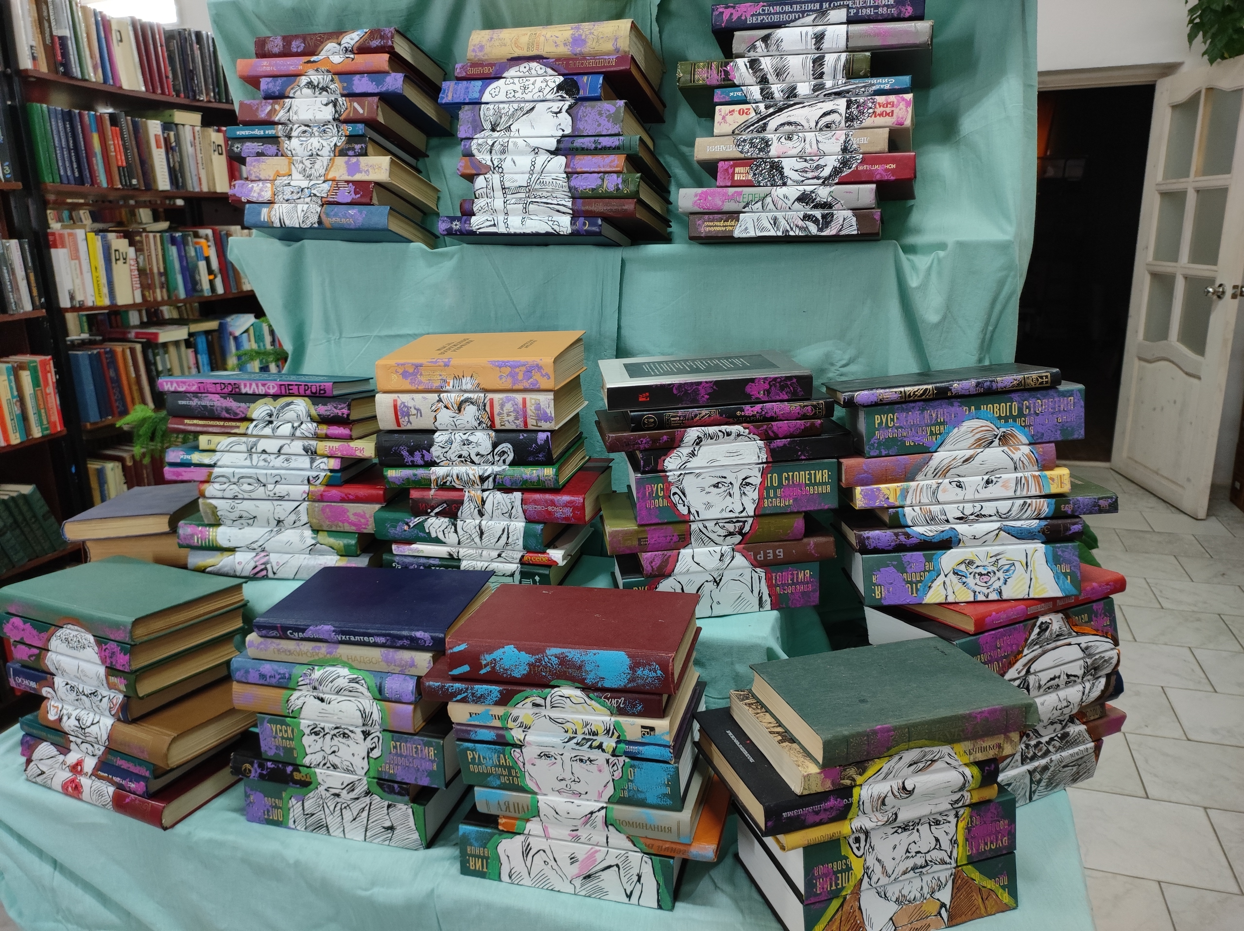 Особенным экспонатом является серия шаржей, написанных художником. Карикатурные изображения русских писателей украсили корочки книг отечественной литературы.