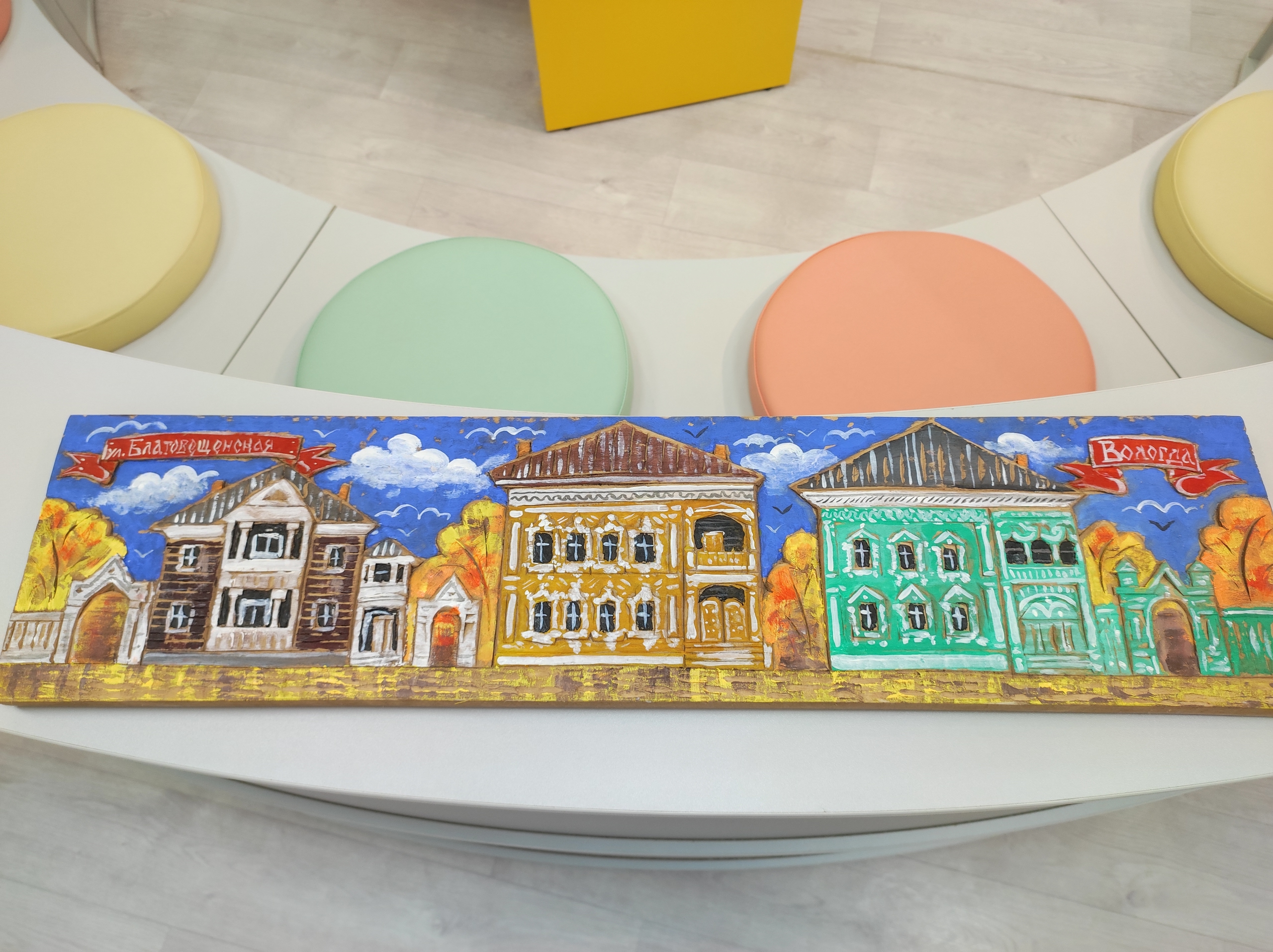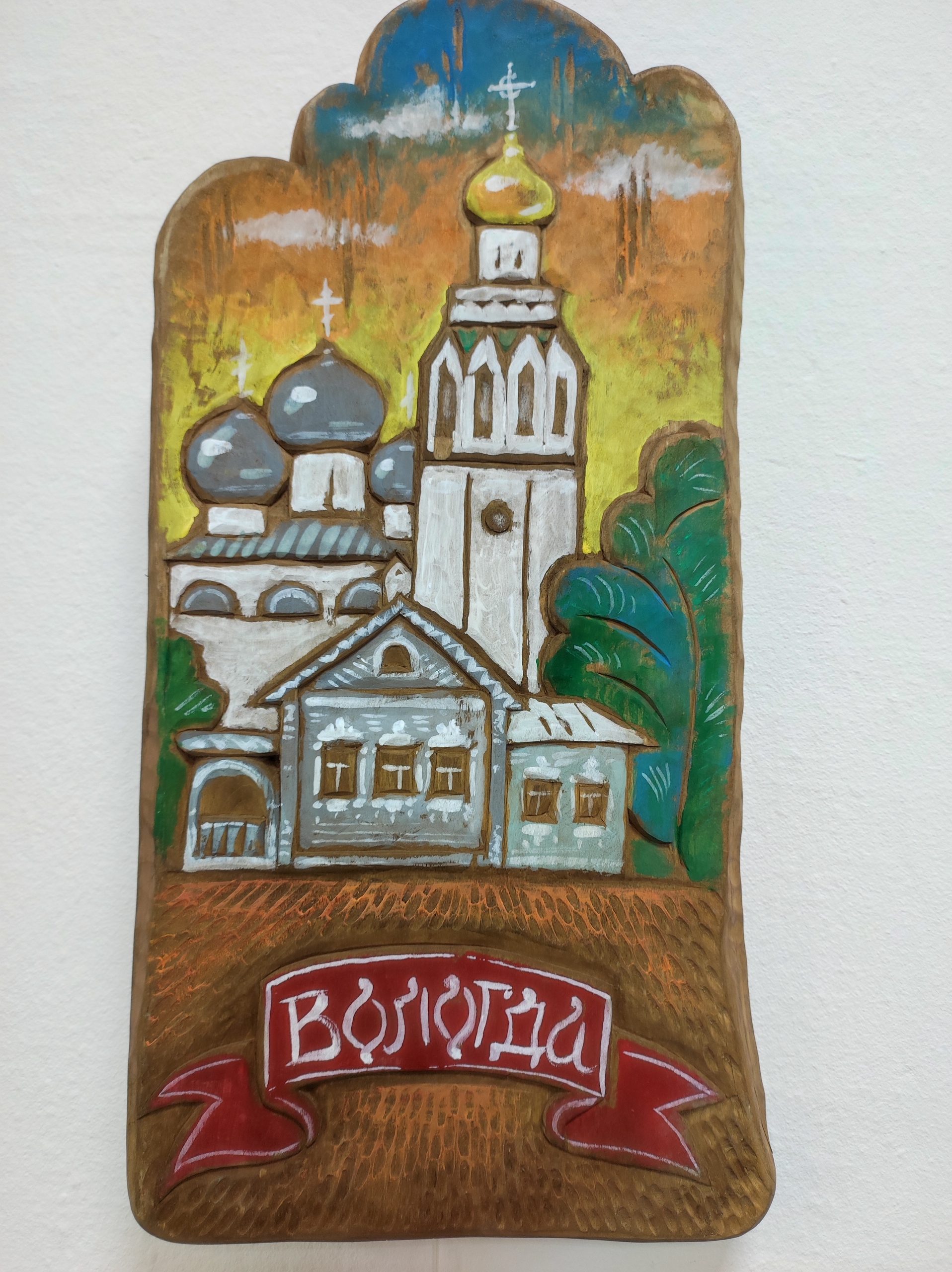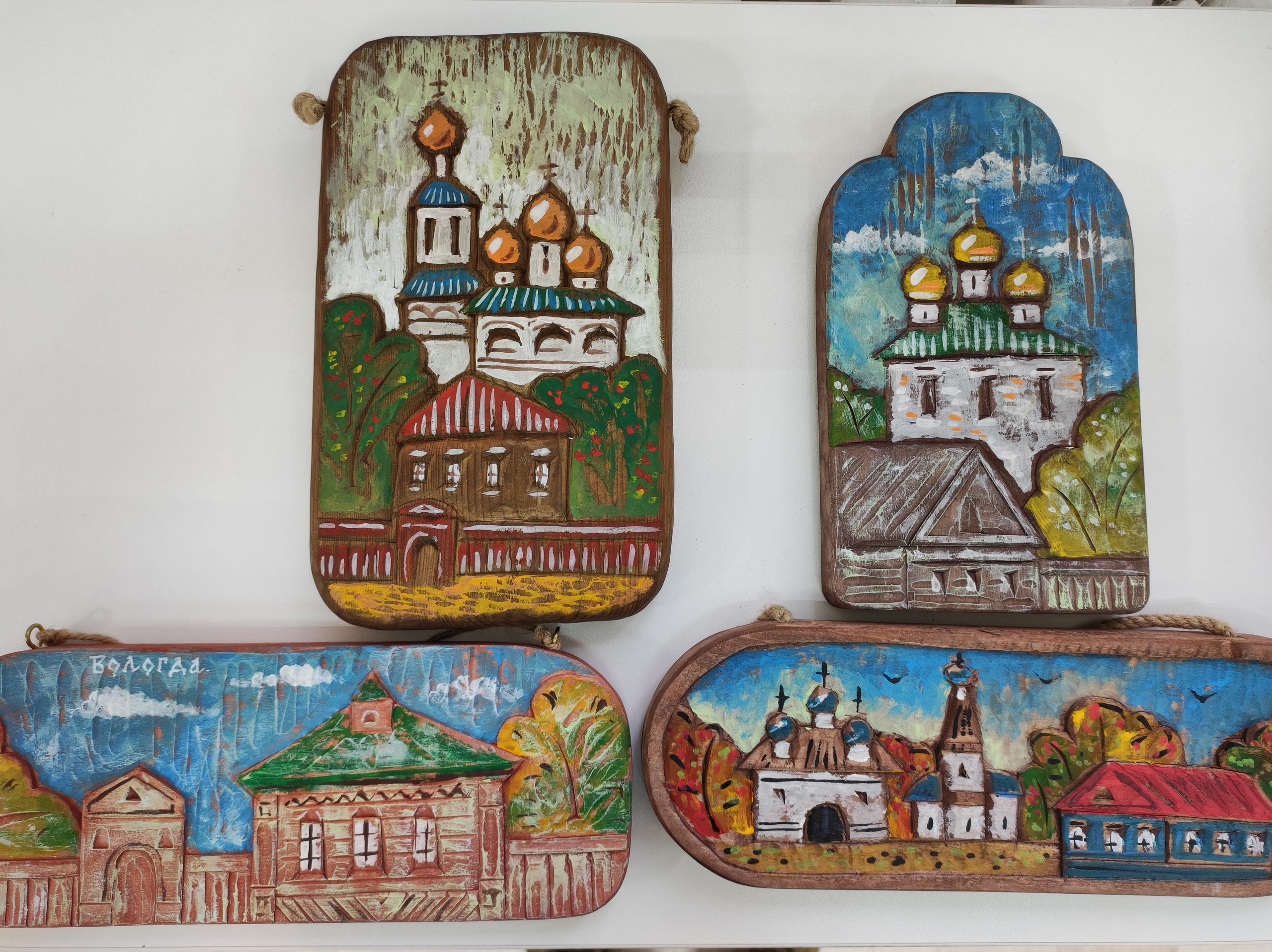 Олег Малинин, член союза русских художников, расписал деревянные заготовки, сделанные Алексеем Борисовым. На дереве изображены пейзажи Вологды и окрестностей города, виды Кирилло-Белозерского монастыря – одного из самых известных историко-архитектурных памятников региона. Не менее ярким экспонатом стали авторские иконы.