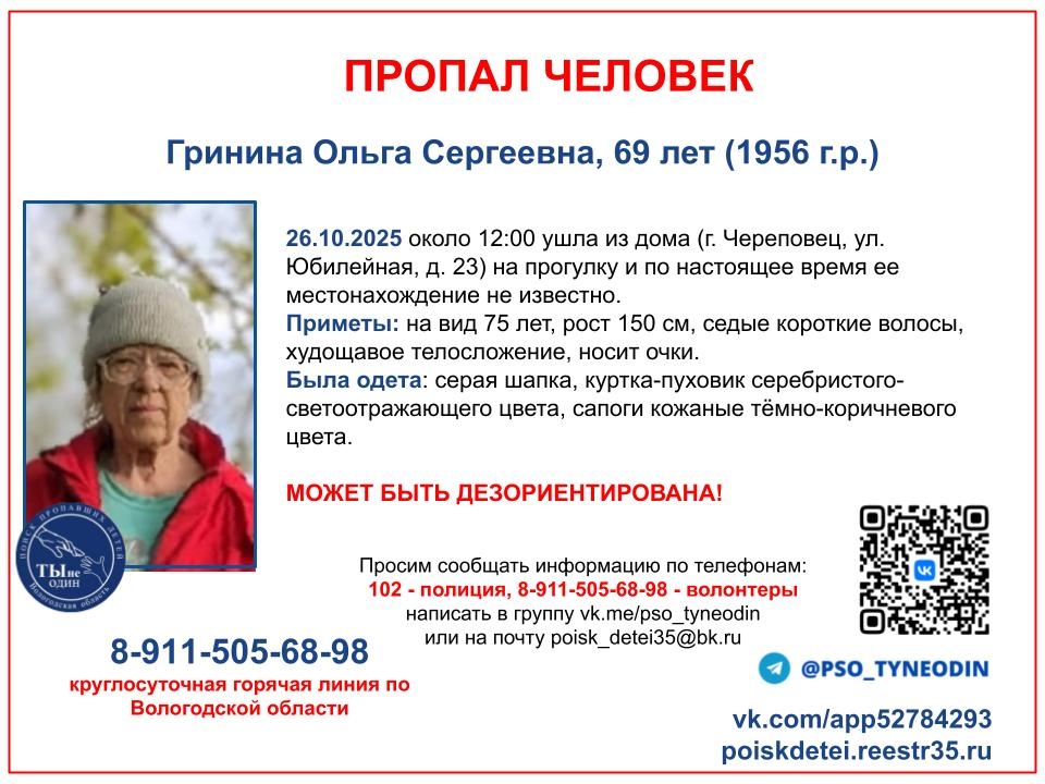 Если вы знаете, где может находиться Ольга Сергеевна, просим передать эту информацию волонтёрам ПСО «Ты не один» по номеру +79115056898 или в полицию – 102, – сообщает ГТРК «Вологда».