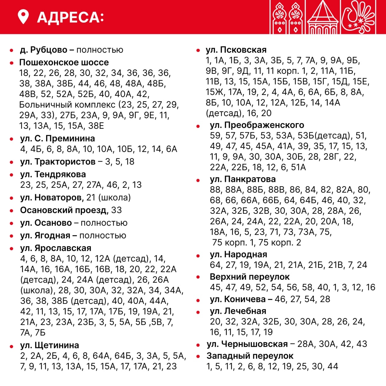 26. ул. Ярославская, 3, 4, 5, 5а, 5б, 5в, 6, 7, 7а, 7б, 8, 8а, 10, 12, 12а, 14, 14а, 16, 16а, 16б, 16в, 18, 20, 22, 22а, 24, 24а, 26, 26а, 28, 30, 30а, 32, 32а, 34, 34а, 36, 38, 38б, 40, 40а, 44а, 42, 11, 13, 15, 17, 17а, 17б, 19, 19а, 21, 21а, 23, 23а, 23б.