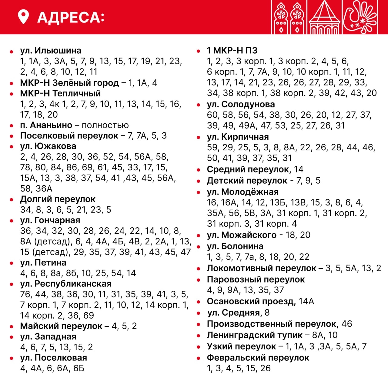 Полный список адресов, попавших под отключение: