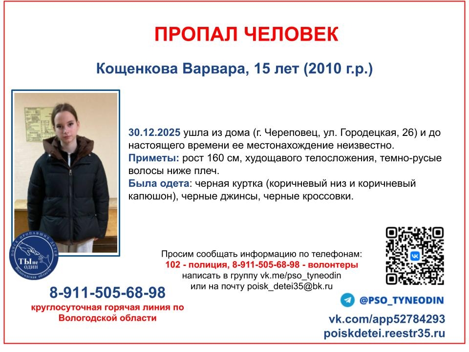 Варвара Кощенкова пропала 30 декабря. Девочка ушла из дома на улице Городецкой и не вернулась. Её местонахождение на данный момент неизвестно.