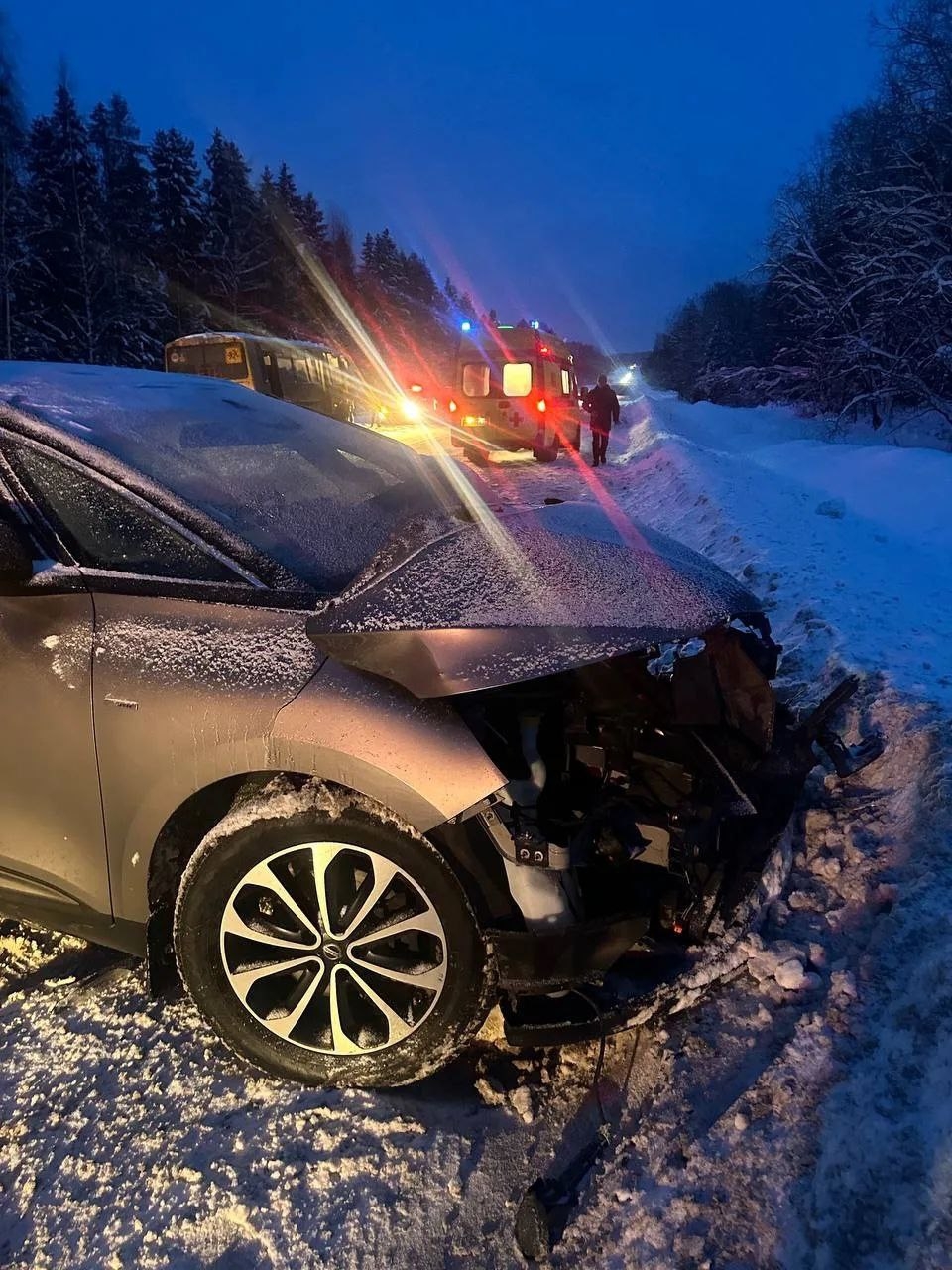 ДТП произошло накануне вечером на 13 километре автодороги Вологда – Ростилово. По предварительной информации, водитель «Рено» – женщина 1985 года – выезжала из села Первомайское в сторону Вологды. При перестроении она не уступила дорогу школьному автобусу. В результате чего произошло столкновение.