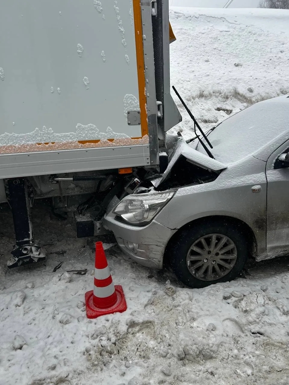 Двигавшийся попутно с большегрузами легковой автомобиль «Равон» под управлением водителя 1985 г.р., применил торможение и съехал на обочину. Там он столкнулся с ранее съехавшим с дороги грузовиком «SITRAK». В результате ДТП пассажирка легкового автомобиля получила травмы. Женщину 1986 г.р. доставили в медучреждение.