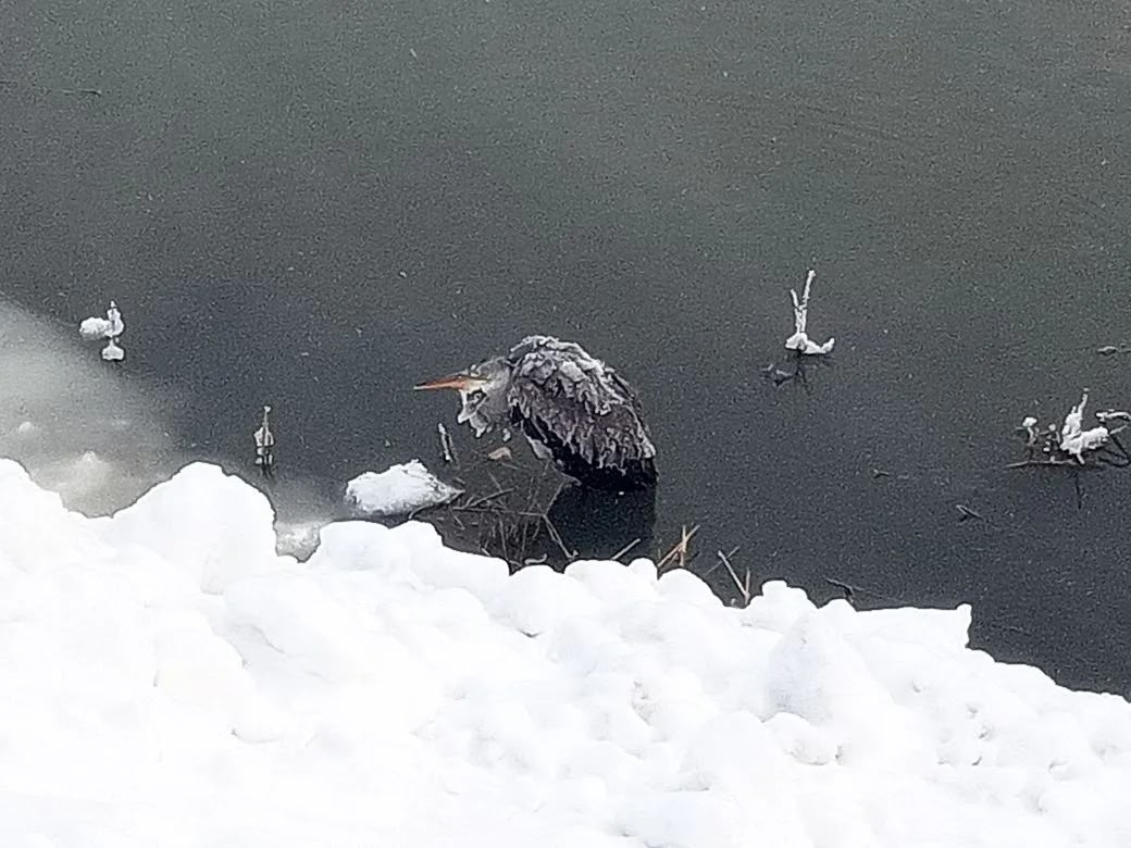 Птица попала в беду в районе улицы Заводской, 20А в Вологде. Цапля застряла в незамерзающем канале и не могла взлететь. Ситуация была критической: пернатая уже покрылась снегом и льдом.