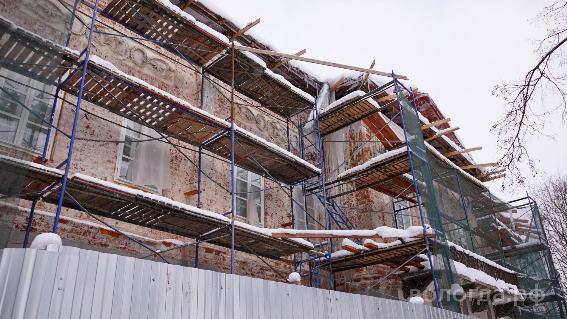 «На объекте проведен очень большой объем работ. В процессе эксплуатации были сильно повреждены стропильные конструкции. Их заменили почти на 80 %. Также выполнена гидроизоляция фундамента, вставлены новые окна, завершен этап по восстановлению кирпичной кладки. В прошлом году подрядчик начал работы по подготовке фасадов к покраске. К ним вернутся, когда позволит погода», – отметили в Главном управлении охраны объектов культурного наследия Вологодской области.