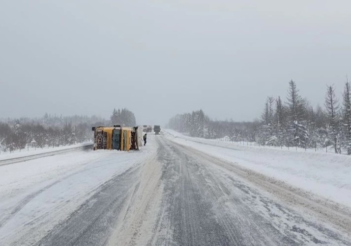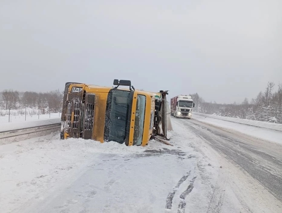 По предварительным данным, мужчина 1988 года рождения, управляя тягачом «Вольво», допустил занос и наезд на дорожное ограждение. В результате ЧП тягач с полуприцепом опрокинулся на трассу. Водитель получил травму головы и ушибы. С места происшествия его доставили в медицинское учреждение для дополнительного обследования.