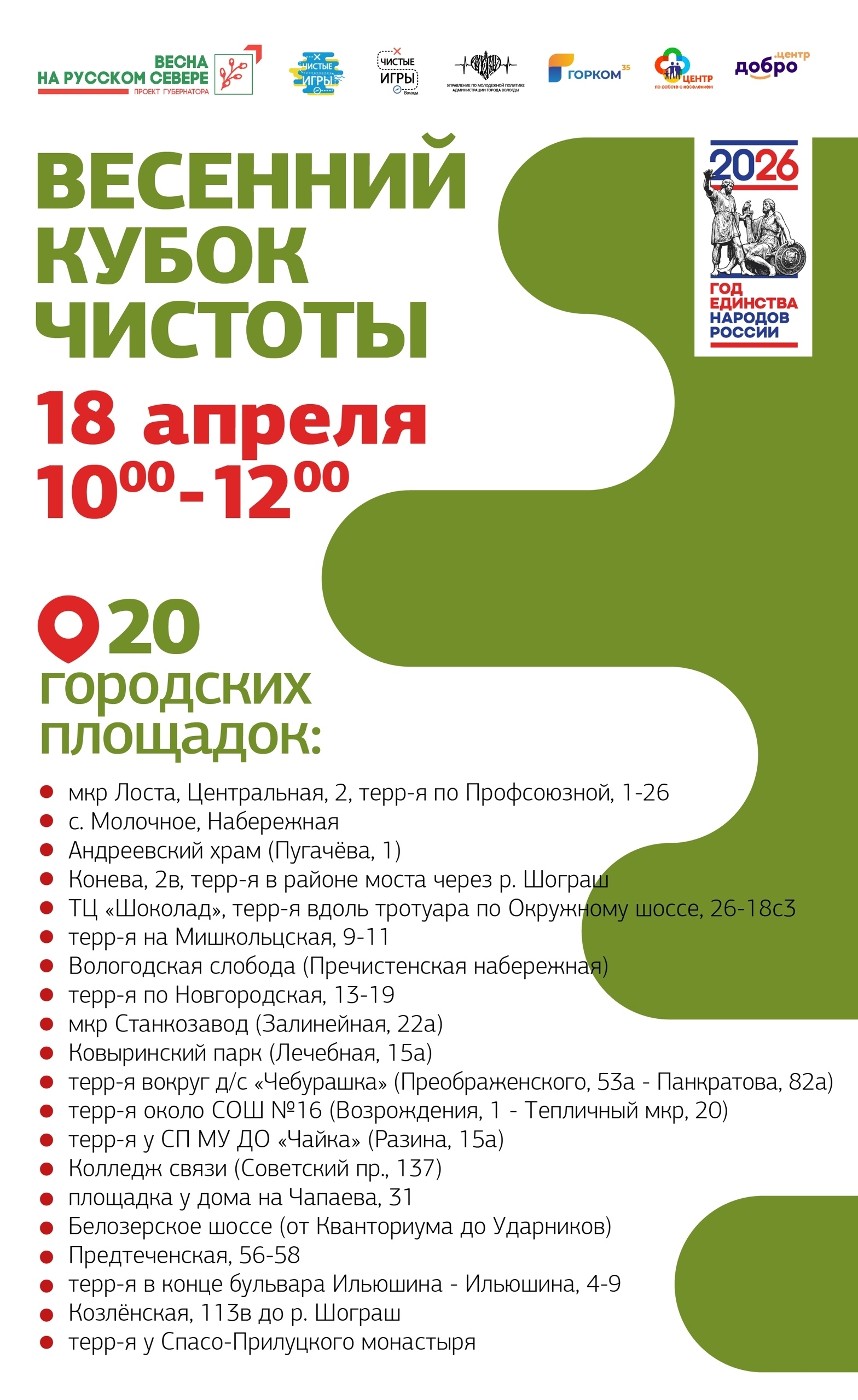 «Весенний кубок чистоты» пройдёт в рамках проекта губернатора Георгия Филимонова «Весна на Русском Севере», – сообщает ГТРК «Вологда» со ссылкой на пресс-службу городской администрации.