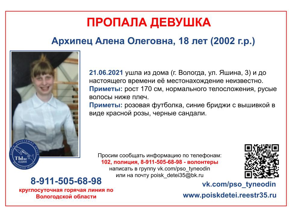 Вторая пропавшая – Архипец Алёна Олеговна. 18-летняя девушка ушла из дома в Вологде на улице Яшина, 23 21 июня 2021 года. До сих пор её местонахождение не известно.