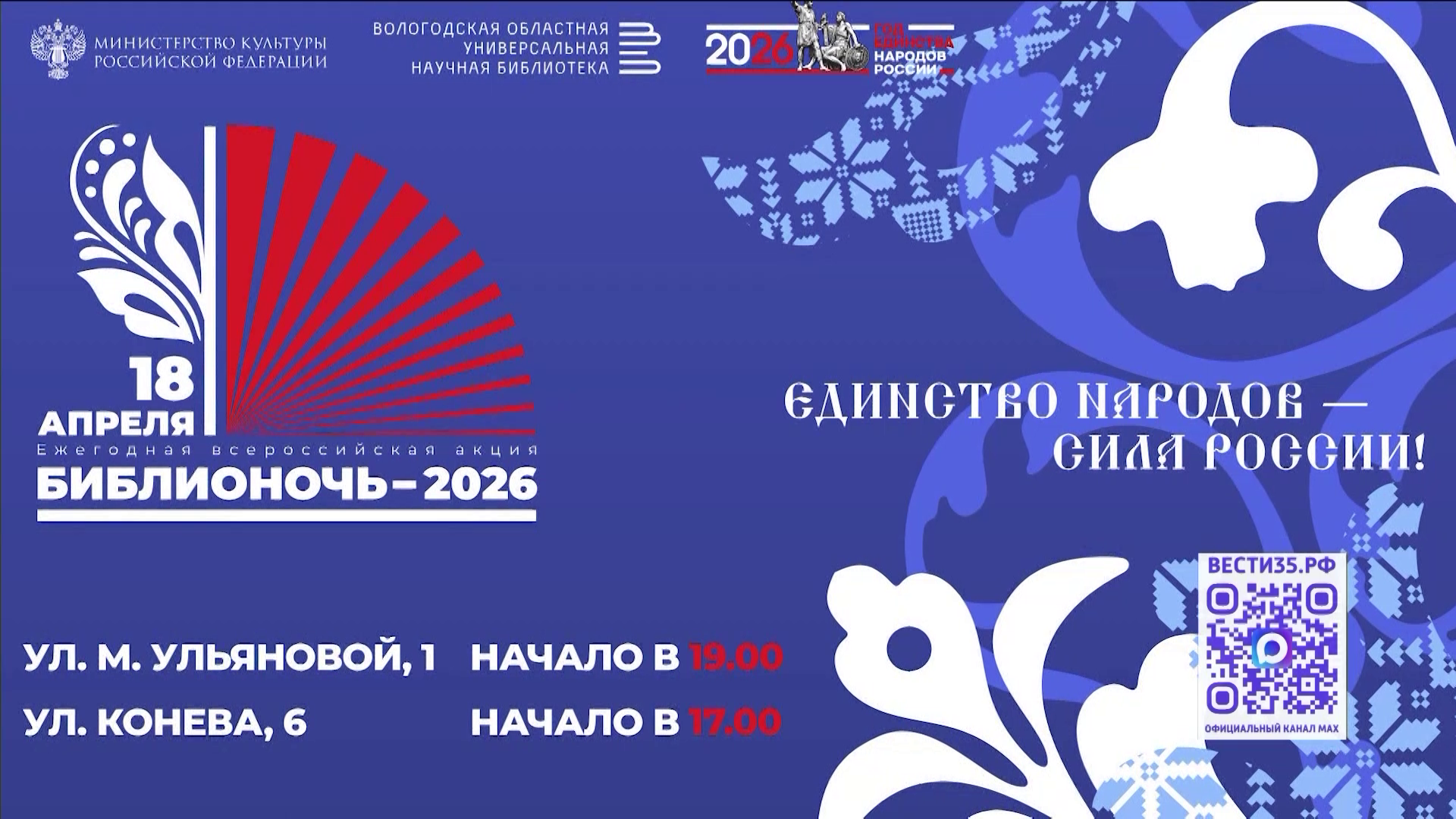 Всероссийская акция «Библионочь» начинается сегодня в Вологде. В этом году она посвящена Году единства народов России. Программу мероприятий откроет областная специальная библиотека. Там пройдёт интерактивное мероприятие для детей «Путешествие по сказкам народов России». Организуют показ фильма с тифлокомментариями, а еще интеллектуальную игру «Посидим, поокаем». Мероприятия акции «Библионочь» в областном центре продолжатся в субботу, – сообщает ГТРК «Вологда».